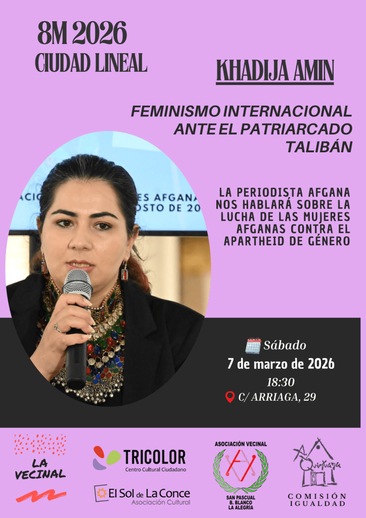 Khadija Amin estará el próximo sábado, 7 de marzo, a las 18:30 h en la Asociación La Tricolor (C/ Arriaga, 29) para hablar del apartheid de género que impera actualmente en Afganistán, que encierra, borra y castiga a las mujeres por existir.