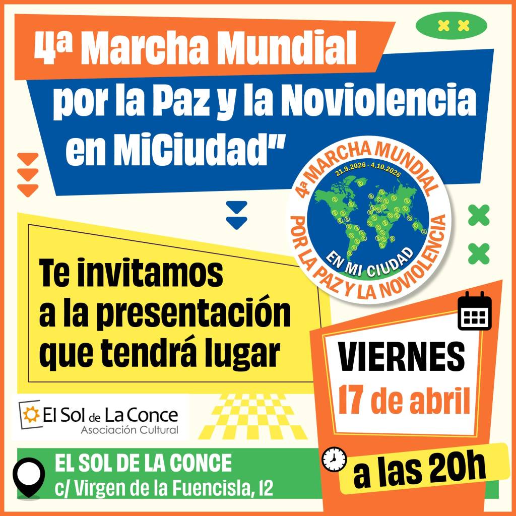 El viernes 17 de abril a las 20:00 nos informarán sobre la 4ª Marcha Mundial por La Paz y La No Violencia.