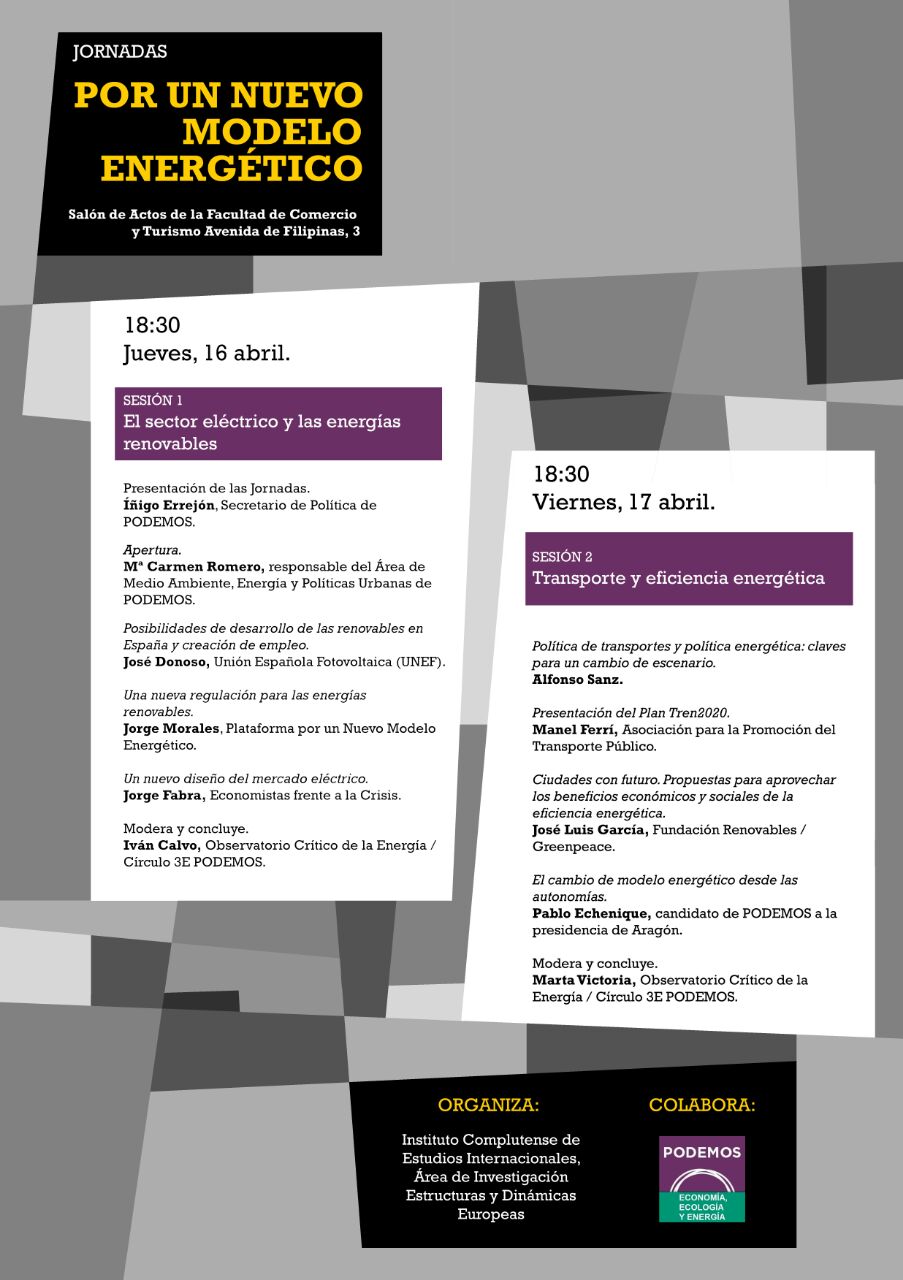 El jueves 16 y viernes 17 de abril, a las 18:30 horas, se celebra en el Salón de Actos de la Facultad de Comercio y Turismo, Avda. de Filipinas nº 3, las jornadas “Por un nuevo modelo energético”