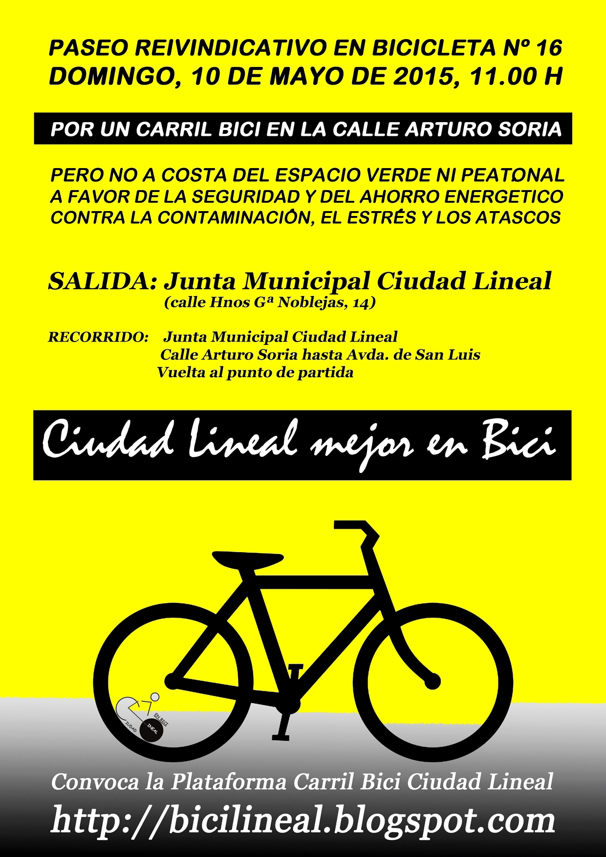 La Plataforma Bicilineal sigue pidiendo desde 2005 una vía ciclista adecuada y segura, que permita vertebrar el barrio de norte a sur, para recuperar el espíritu y las pautas marcadas por el urbanista Arturo Soria, tal como concibió la Ciudad Lineal hace más de cien años. Quieren que sea una vía por la calzada, no a costa del espacio peatonal ni del espacio verde. Os invitamos a visitar el blog, http://bicilineal.blogspot.com donde disponen de toda la información relativa a esta reivindicación, el proyecto y las últimas iniciativas realizadas por la Plataforma, incluidos los apoyos recibidos de las Asociaciones Vecinales e Instituciones Educativas (prácticamente todos los centros públicos y privados) del distrito.