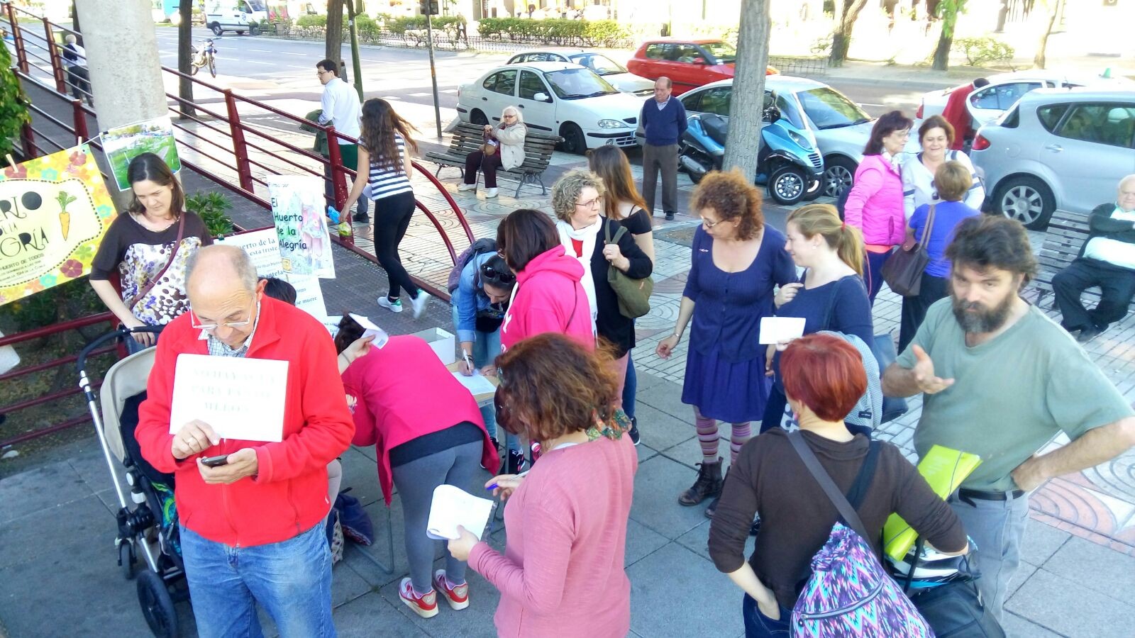 Consistió en la instalación de una mesa informativa junto a la que se colgaron fotos actuales del huerto y los objetivos de su carácter comunitario. Se repartieron folletos informativos y, como no, habas, lechugas y escarolas recolectadas ese mismo día. También se puso a disposición pliegos de firmas para que la gente exprese su apoyo.