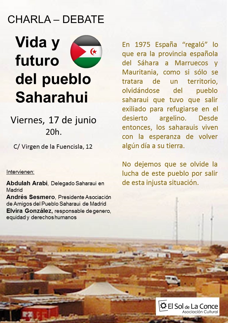 En 1975 España “regaló” lo que era la provincia española del Sáhara a Marruecos y Mauritania, como si sólo se tratara de un territorio, olvidándose del pueblo saharaui que tuvo que salir exiliado para refugiarse en el desierto argelino. Desde entonces, los saharauis viven con la esperanza de volver algún día a su tierra. El Delegado del Pueblo Saharaui en Madrid y una representante de la Asociación de Amigos del Pueblo Saharaui nos informarán de su vida en los campamentos en Argel y de cómo ven su futuro. No dejemos que se olvide la lucha de este pueblo por salir de esta injusta situación.