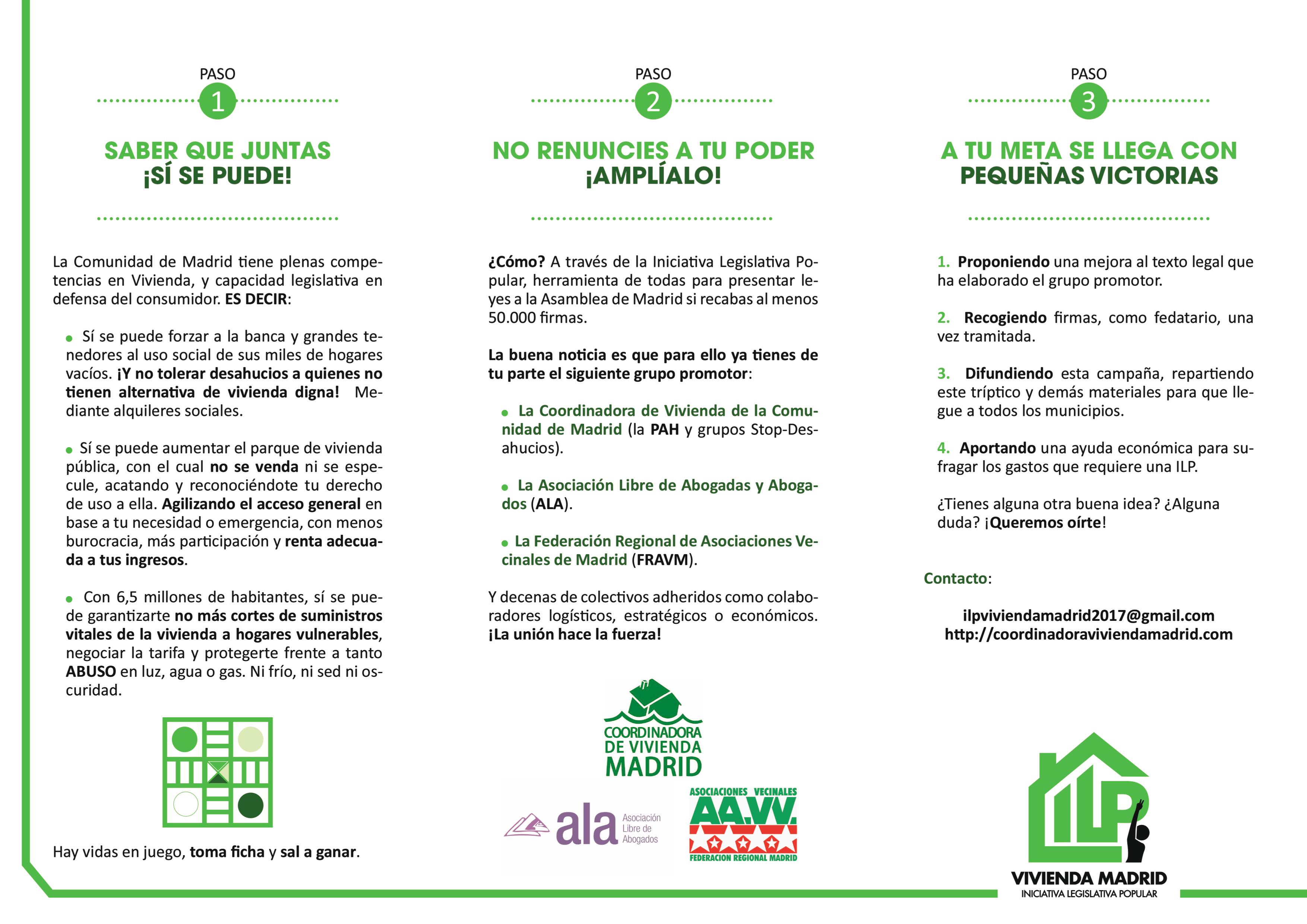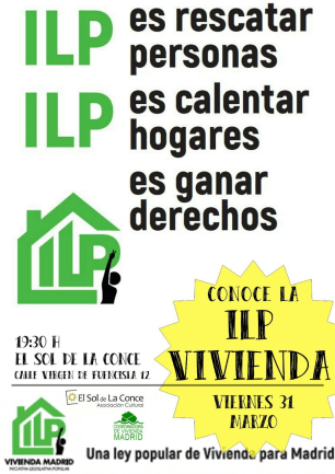 El próximo viernes, 31 de marzo, habrá una charla informativa sobre la ILP de la LEY URGENTE DEL DERECHO A LA VIVIENDA EN LA COMUNIDAD DE MADRID.
