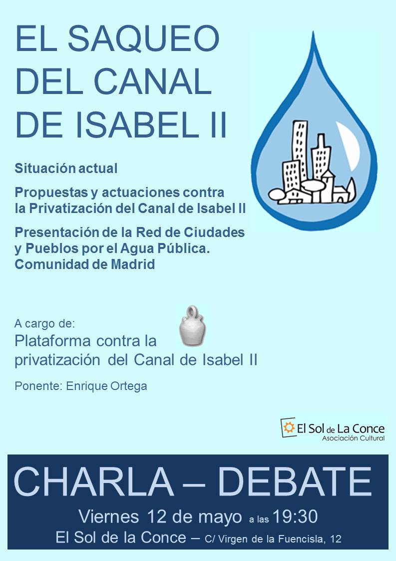 Este viernes, 12 de mayo, celebraremos una charla-debate donde vamos a analizar la situación actual del Canal de Isabel II, los graves procesos de corrupción en los que está inmerso (operación Púnica, operación Tosca, operación Lezo,…) y las propuestas y actuaciones que la Plataforma está llevando a cabo en ayuntamientos, en la Asamblea de Madrid y en la sociedad. También presentaremos la red de ciudades y pueblos por el agua pública, cuyo objetivo es unir los esfuerzos de ciudadanos, cargos institucionales, activistas de los movimientos sociales, profesionales, etc. para defender el agua pública y la gestión democrática, sostenible y participativa de los servicios del agua en nuestra comunidad autónoma.