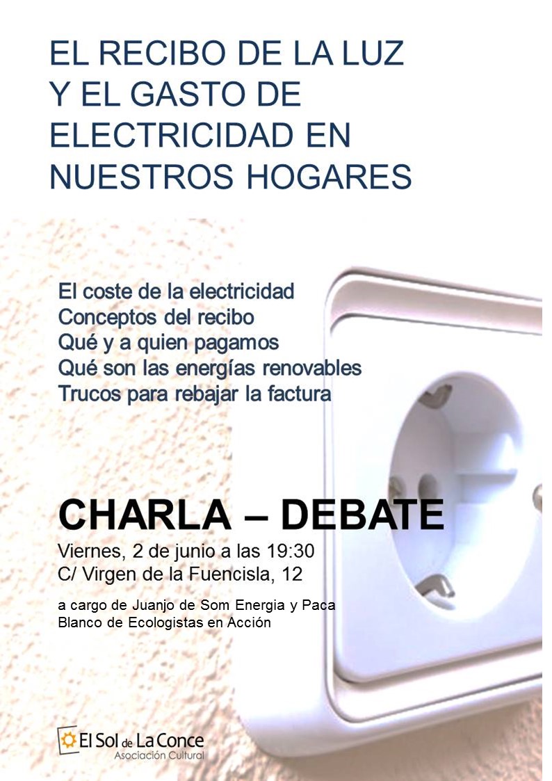 El próximo viernes, 2 de junio, Juanjo de Som Energía y Paca Blanco de Ecologistas en Acción nos hablarán sobre el coste de la electricidad, nos ayudarán a entender el recibo de la luz, qué y a quién pagamos, cómo rebajar nuestra factura, y hablarán también sobre las energías renovables.