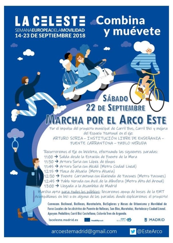 El próximo sábado 22 de septiembre, la Plataforma Ciudadana Bicilineal junto con un gran número de asociaciones del distrito de Ciudad Lineal, han organizado una marcha en bicicleta y autobús, para impulsar un carril bici, un carril bus y la mejora del espacio peatonal en uno de los ejes periféricos más importantes de Madrid, el eje: Arturo Soria — Institución Libre de Enseñanza — Fuente Carrantona — Pablo Neruda.