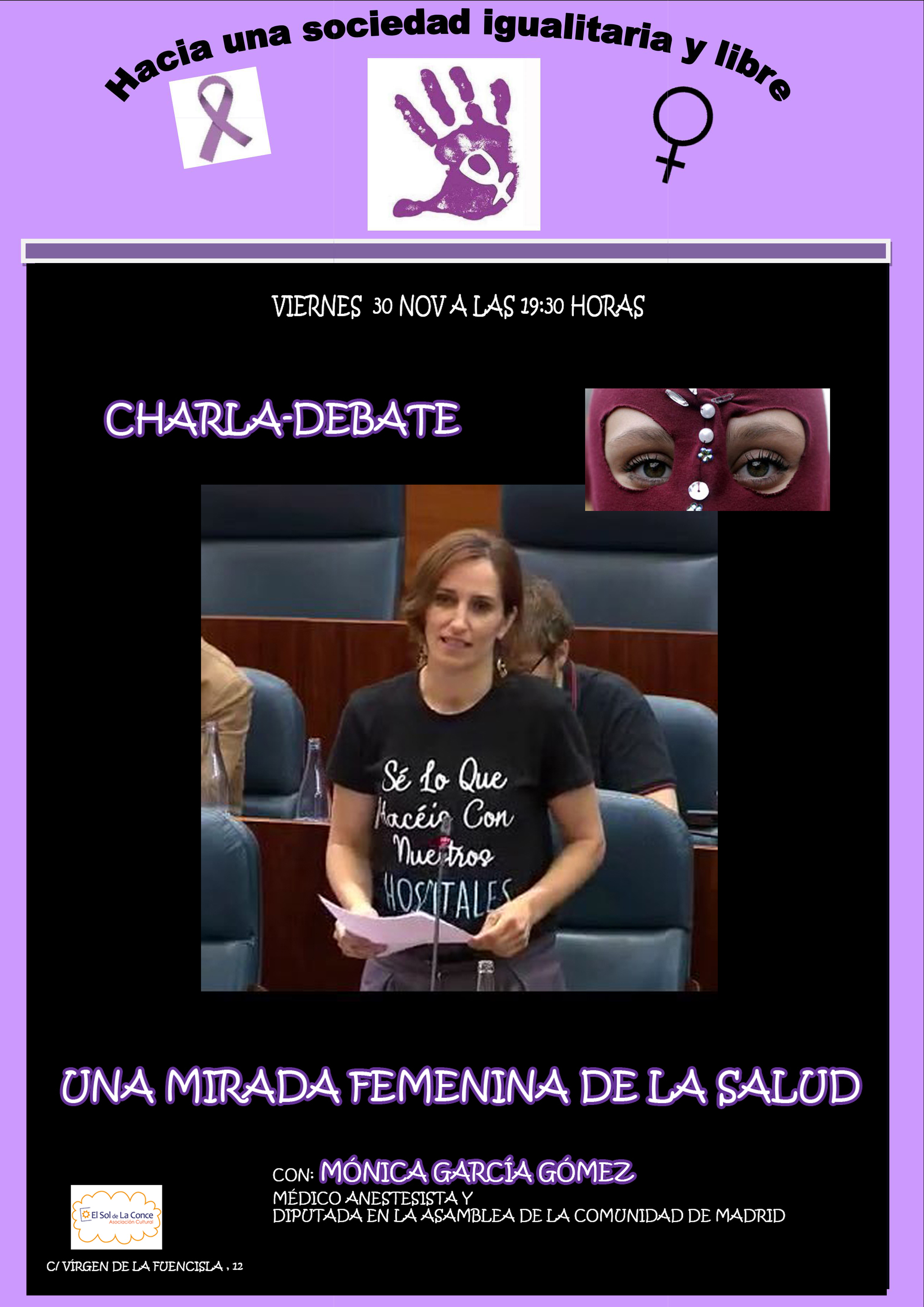 Dentro del ciclo de actividades «Caminando hacia una sociedad igualitaria y libre», el próximo viernes 30 de noviembre a las 19:30 h, Mónica García Gómez, Diputada de la Asamblea de Madrid, nos hablará de la salud, desde una mirada femenina, que nos ayudará a descubrir cómo el sesgo de género afecta también a un ámbito como el de la salud y las consecuencias que esto conlleva.