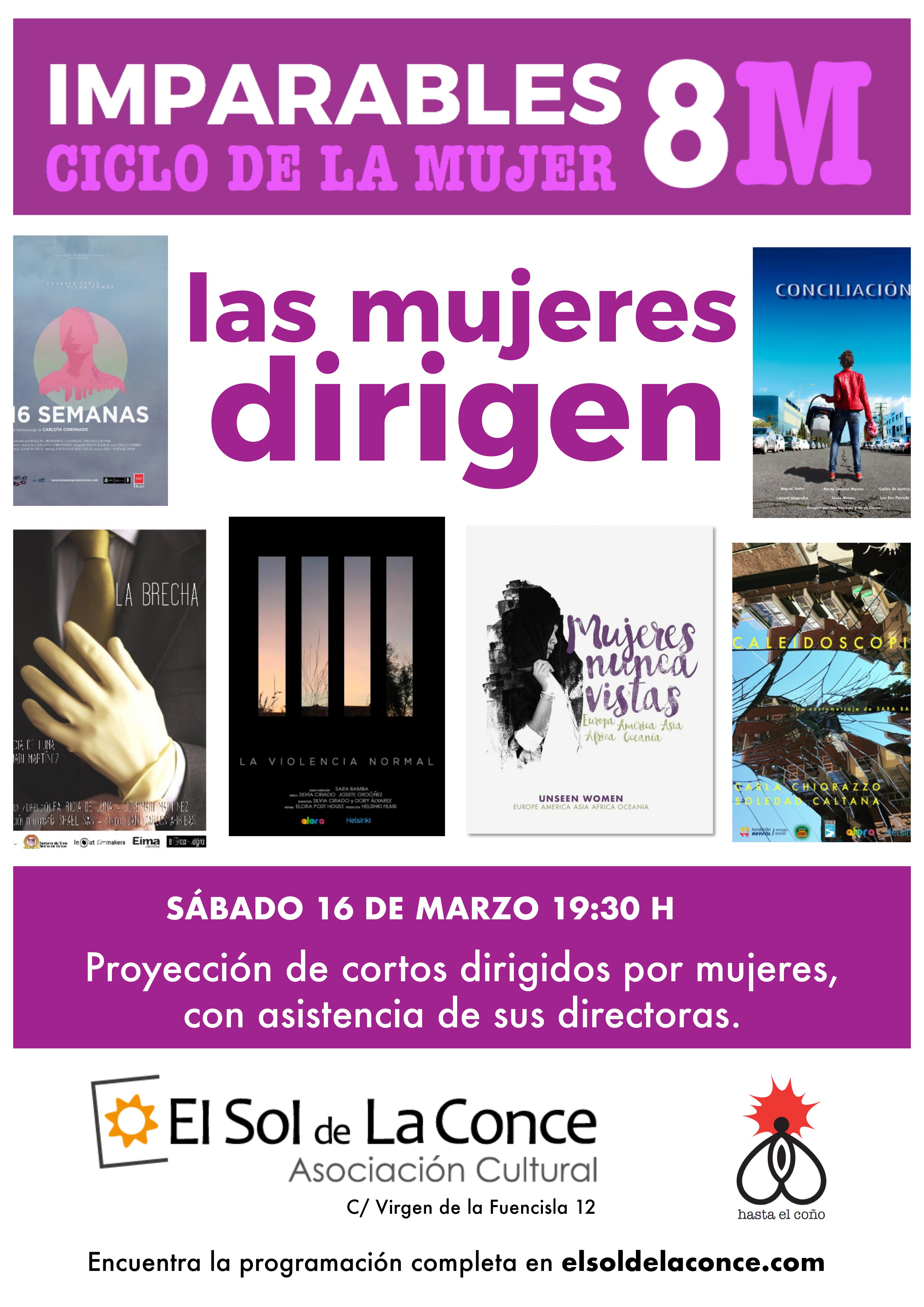 El sábado 16 de marzo, a las 19:30 h, podremos disfrutar de la proyección de varios cortos dirigidos por mujeres. Nos acompañarán durante la velada varias de sus directoras, con las que podremos charlas e intercambiar opiniones sobre los temas que abordan los cortos, mundo laboral, maternidad, violencia, conciliación…