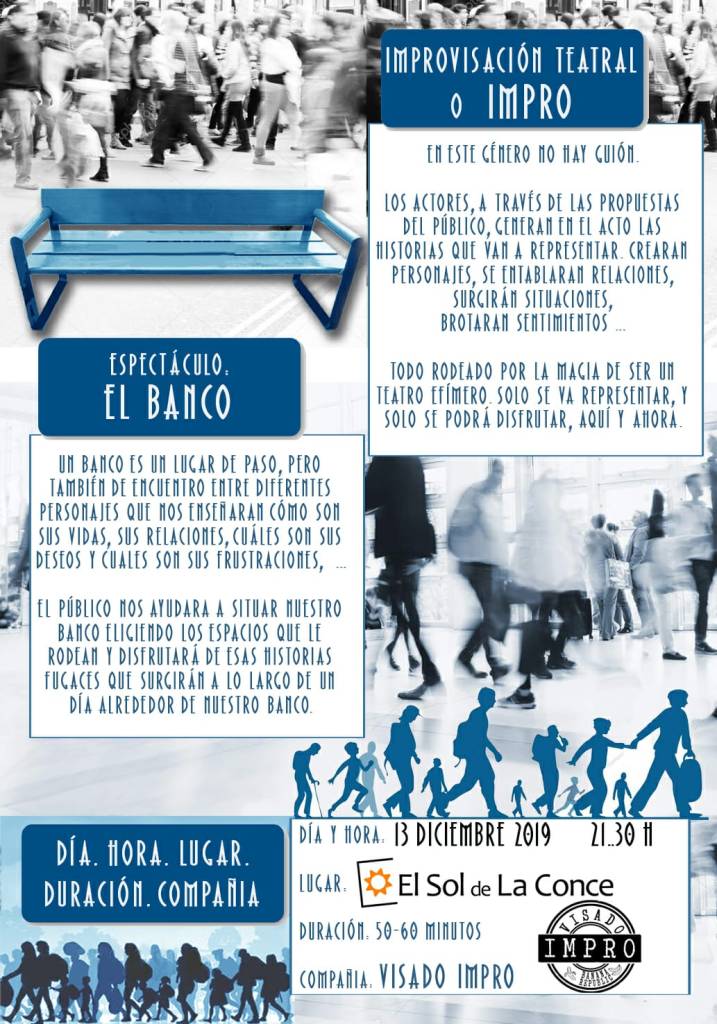 El próximo viernes 13 de diciembre, a las 21:30 h, os invitamos a participar en el «El Banco» de la compañía VISADO IMPRO, un espectáculo de improvisación teatral en el que, a través de las propuestas del público, se irán generando las historias a representar.