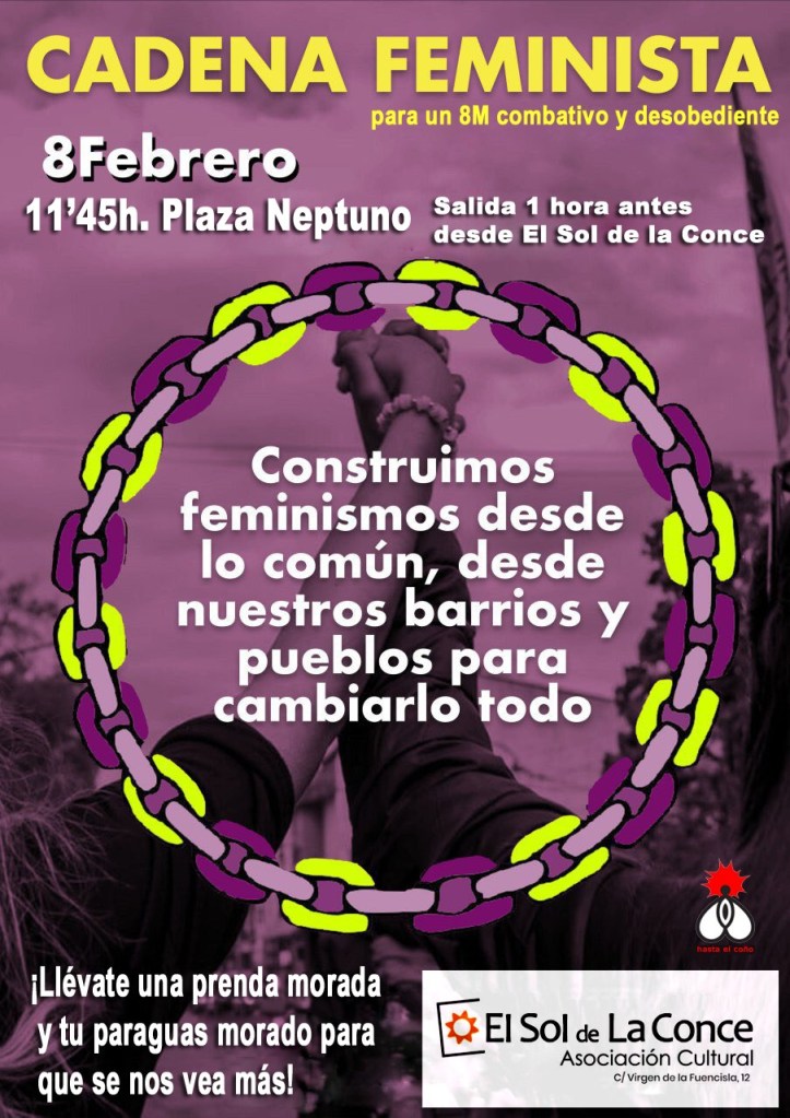 Desde el espacio de mujeres de El Sol de La Conce te invitamos a acompañarnos este sábado 8 de febrero a apoyar la cadena feminista que se va a construir en Madrid en preparación del próximo 8M. Saldremos de nuestra asociación a las 10:45 para unirnos en la Plaza de Neptuno a la Cadena que construiremos entre todos los barrios y pueblos de Madrid.