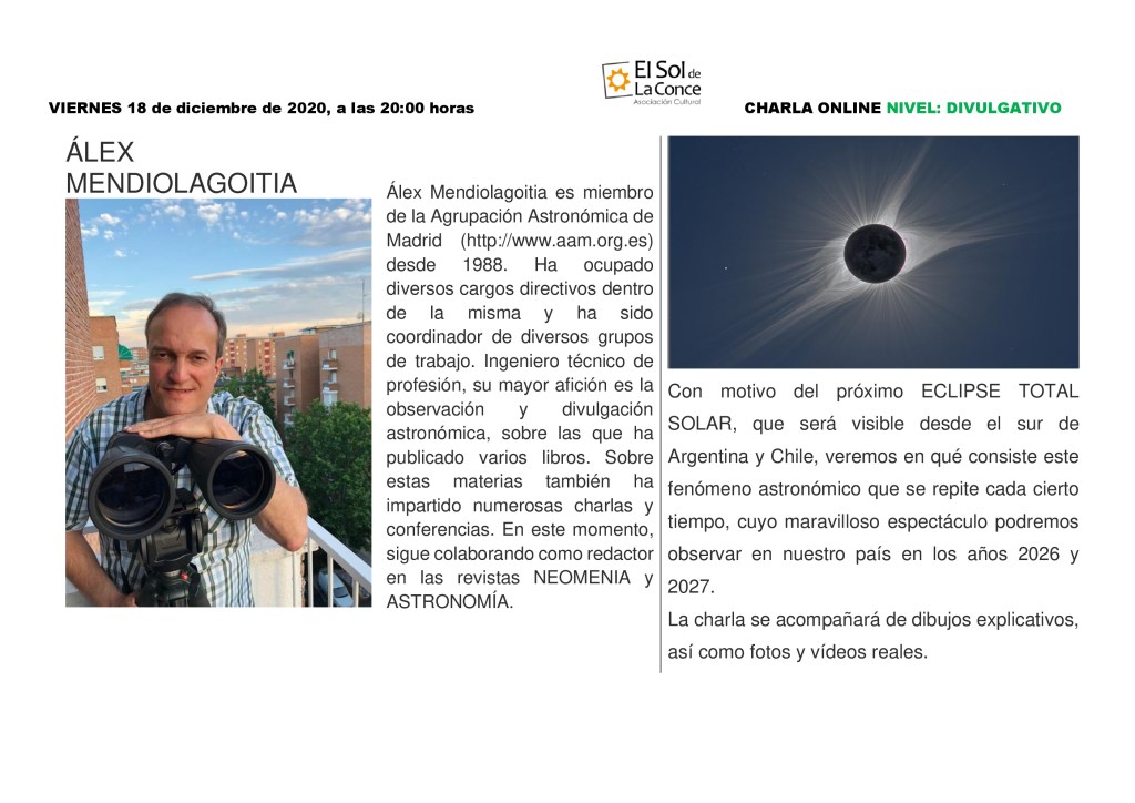 El próximo viernes, 18 de diciembre de 2020, a las 20 h, el Sol de la Conce os invita a participar en una charla online sobre astronomía a cargo de Álex Mendiolagoitia, miembro de la Agrupación Astronómica de Madrid.