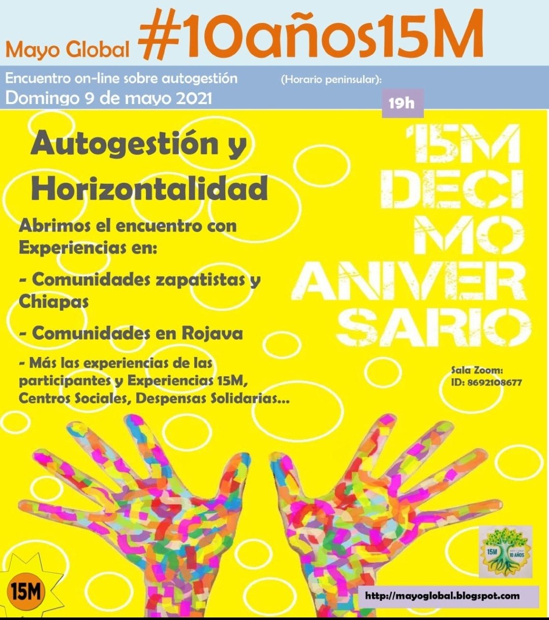 Encuentro on-line de mujeres el sábado 8 de mayo a las 19h y sobre autogestión el domingo 9 de mayo a las 19h (horas peninsulares). Adjuntamos los carteles, donde podéis ver más detalle.