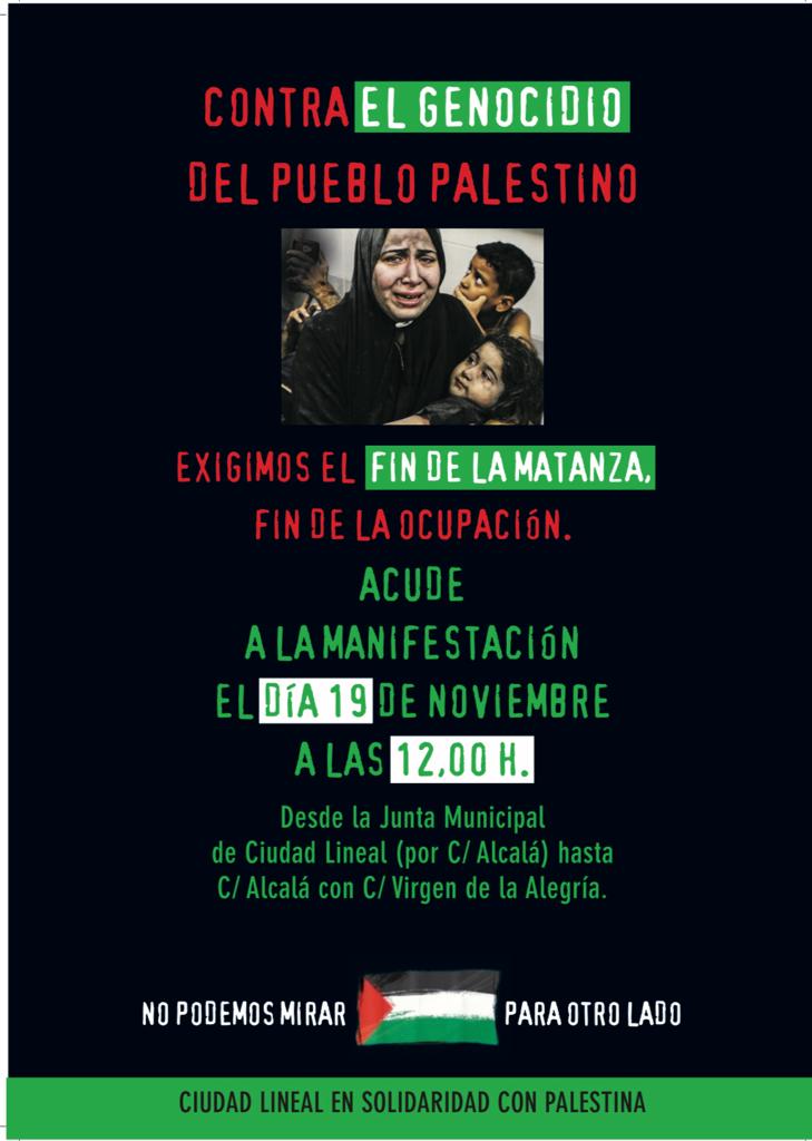 Este domingo, 19 de noviembre, acude a la manifestación que recorrerá las calles del distrito de Ciudad Lineal pidiendo el fin del genocidio palestino.
