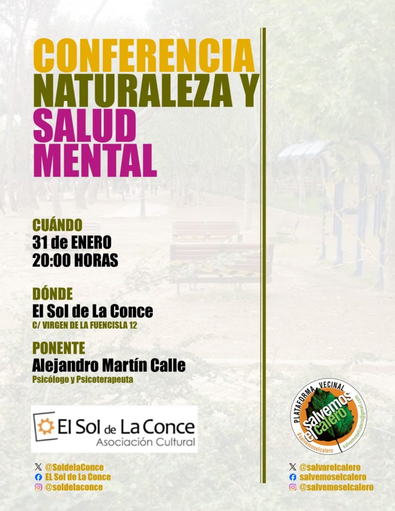 El próximo viernes 31 de enero a las 20:00h os invitamos a esta segunda «charla saludable», en la que abordaremos la importancia que tienen las zonas verdes en nuestra salud mental; especialmente en las ciudades, donde ya vimos en el encuentro anterior que es más difícil disfrutar y disponer de ellas dependiendo del barrio.