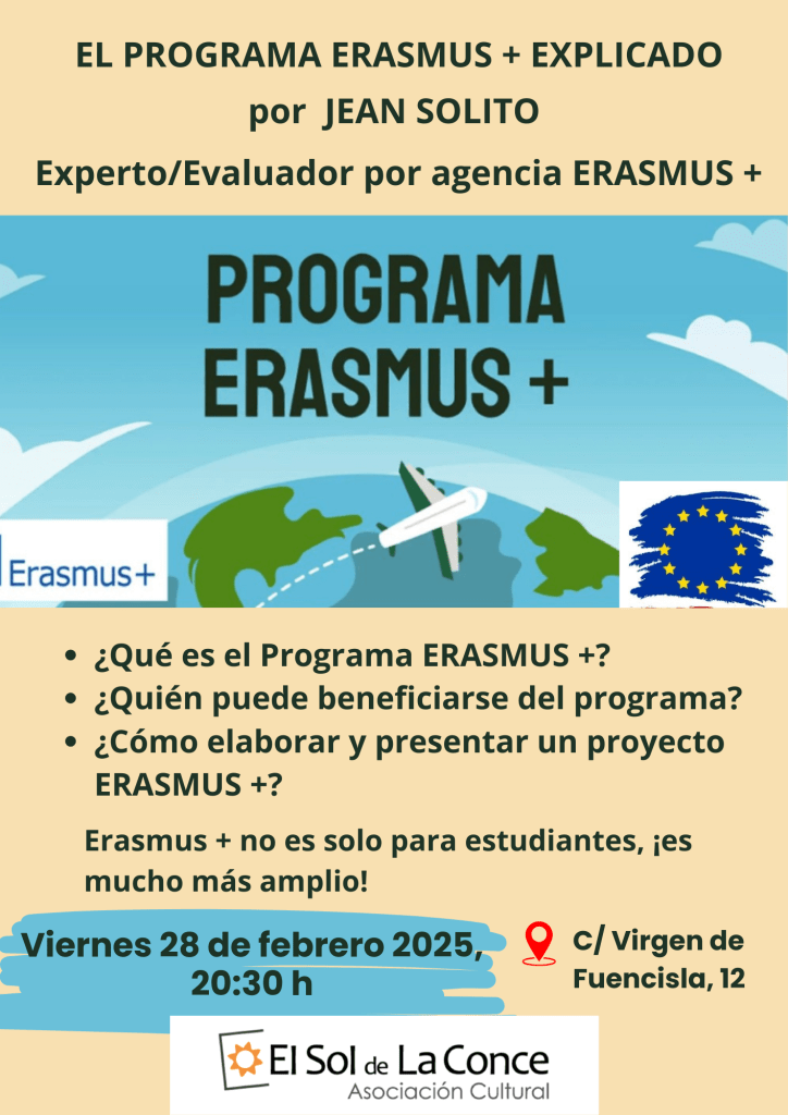 El próximo viernes 28 de febrero a las 20:30h, Jean Solito, compañero de El Sol y experto evaluador de la Agencia Erasmus +, nos contará todos los detalles de este programa europeo.