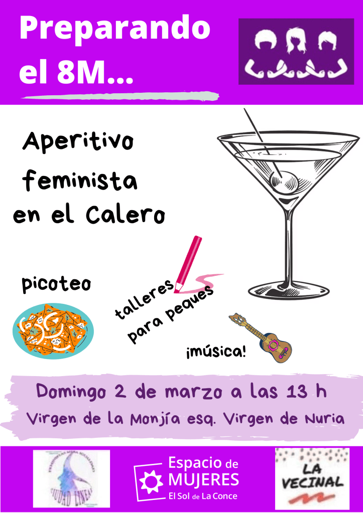 El Espacio de Mujeres de El Sol de Conce, junto con las compañeras de La Vecinal y la Mesa de Igualdad de Ciudad Lineal, hemos preparado un vermut feminista para la mañana del domingo 2 de marzo, a partir de las 13 h, en el Parque Calero. Os invitamos a que compartáis un rato con nosotras.