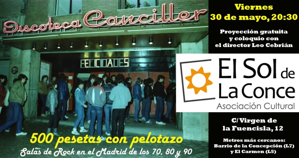El próximo viernes, 30 de mayo, a las 20:30, os invitamos a disfrutar del documental de Leo Cebrián «500 pesetas con pelotazo», sobre las salas de Rock en el Madrid de los 70, 80 y 90, y posterior coloquio con la presencia de su director.