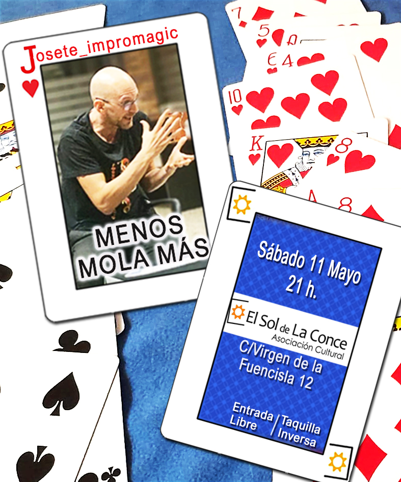 ‘Menos mola más‘ es una sesión de cartomagia (SOLO CARTAS) de cerca (MUY CERQUITA) con risas (MUCHAS RISAS) íntima (POQUITA POQUITA GENTE) y vacile (MUCHO VACILE) donde Josete compartirá la magia con la que ha crecido, con la que ha perdido el pelo y que le sigue haciendo muy muy feliz.