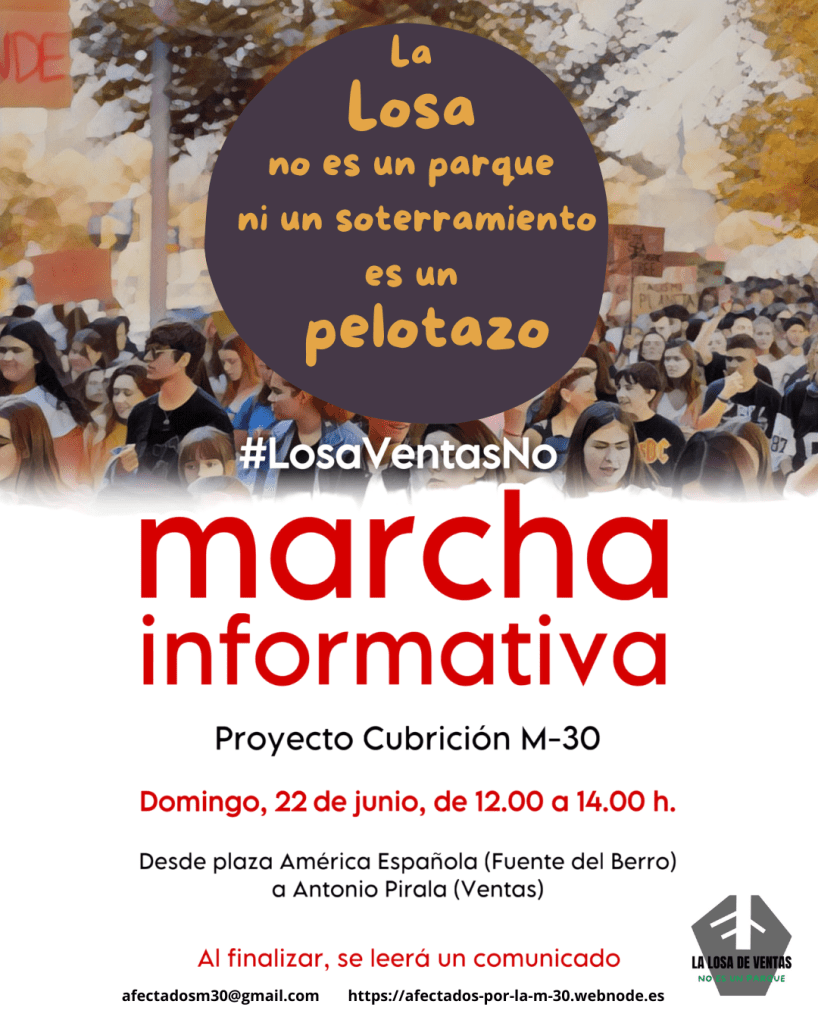 El próximo domingo 22 a las 12:00 la Plataforma de Afectados M30, apoyados por asociaciones vecinales y ecologistas, convocan una marcha informativa que saldrá desde en la Plaza de la América Española y recorrerá toda la zona afectada por la futura construcción de la losa de Ventas. Al final del acto se leerá un comunicado.