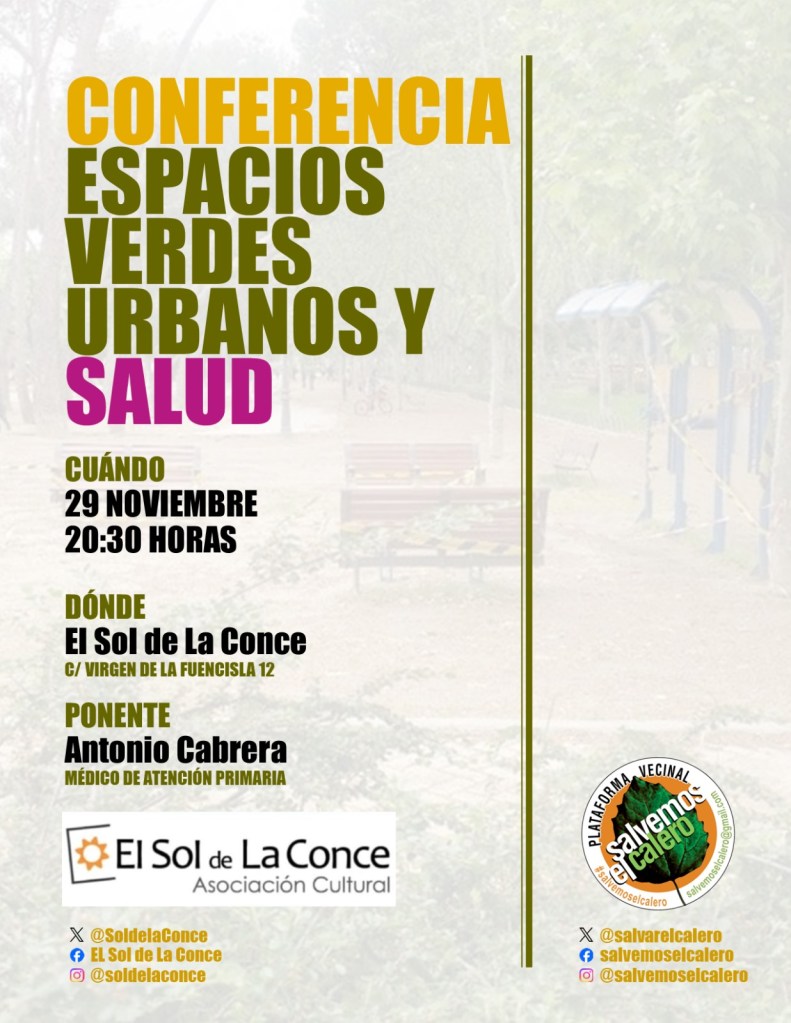 El próximo viernes 29 de noviembre a las 20:30, os invitamos a esta primera “charla saludable” en la que el doctor Antonio Cabrera, médico de atención primaria, nos desvelará la importancia que tienen las zonas verdes y entornos naturales en nuestra salud física, especialmente en las ciudades.