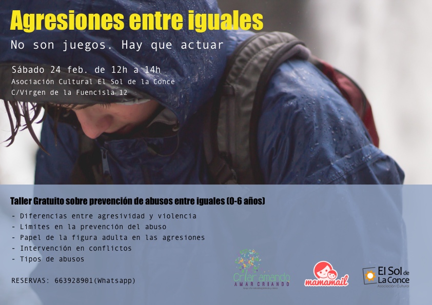 El próximo sábado 24 de febrero, de 12:00 a 14:00 h, se impartirá un taller sobre prevención de abusos entre iguales.