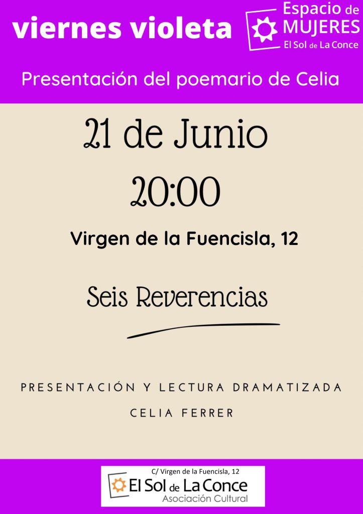 El próximo 21 de Junio a las 20 h, se presentará «Seis reverencias«, un poemario de verso libre escrito por la actriz Celia Ferrer.