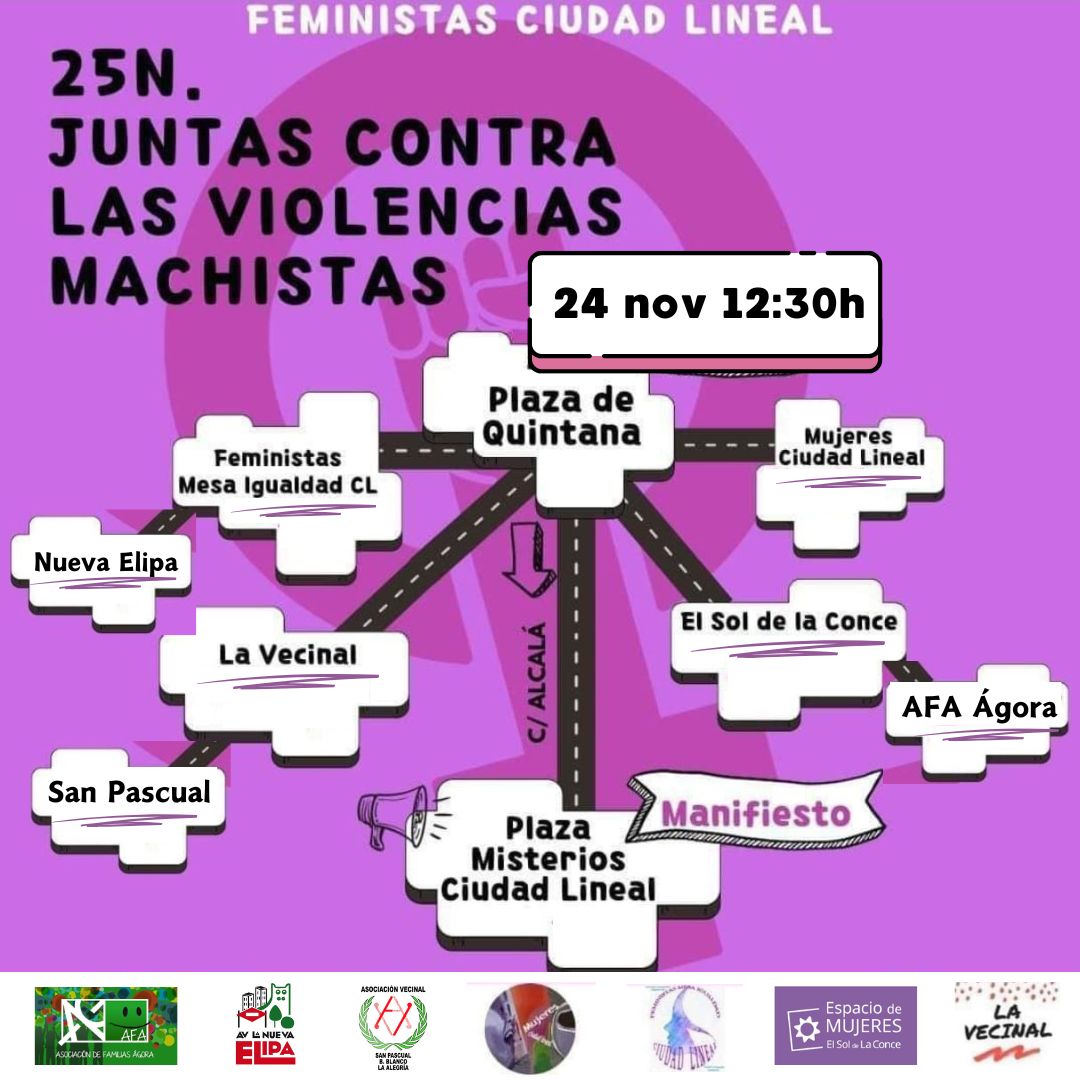 - 12:30 h, en la Plaza de Quintana: las asociaciones y plataformas feministas del Distrito de Ciudad Lineal marcharemos por la calle Alcalá hasta la Plaza de los Misterios, en Ciudad Lineal, para gritar alto y fuerte contra todas las violencias machistas.