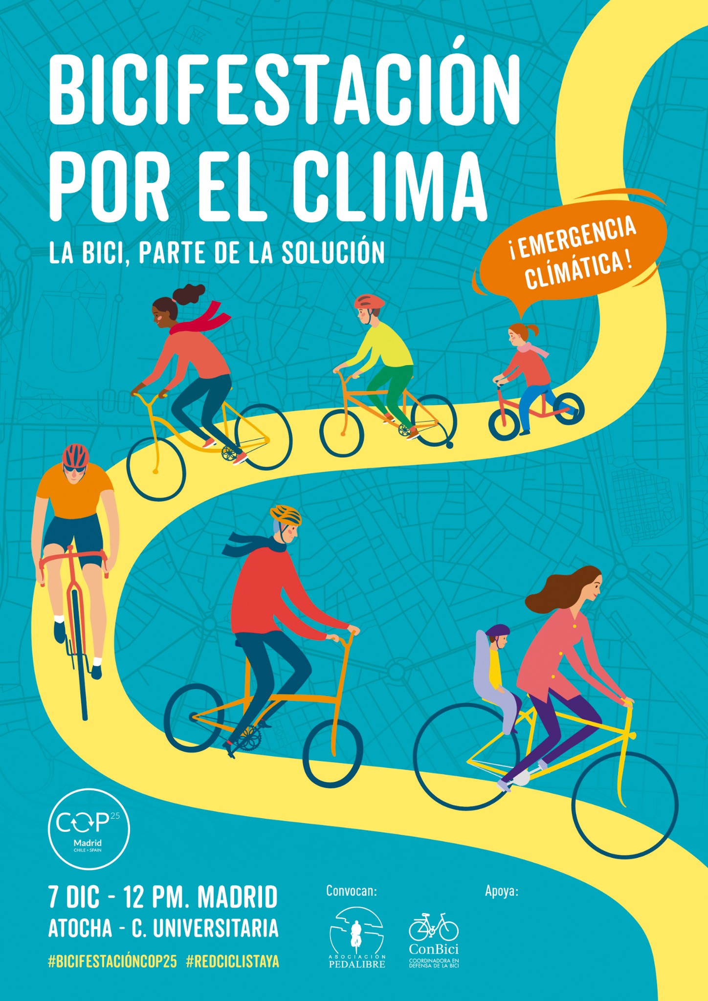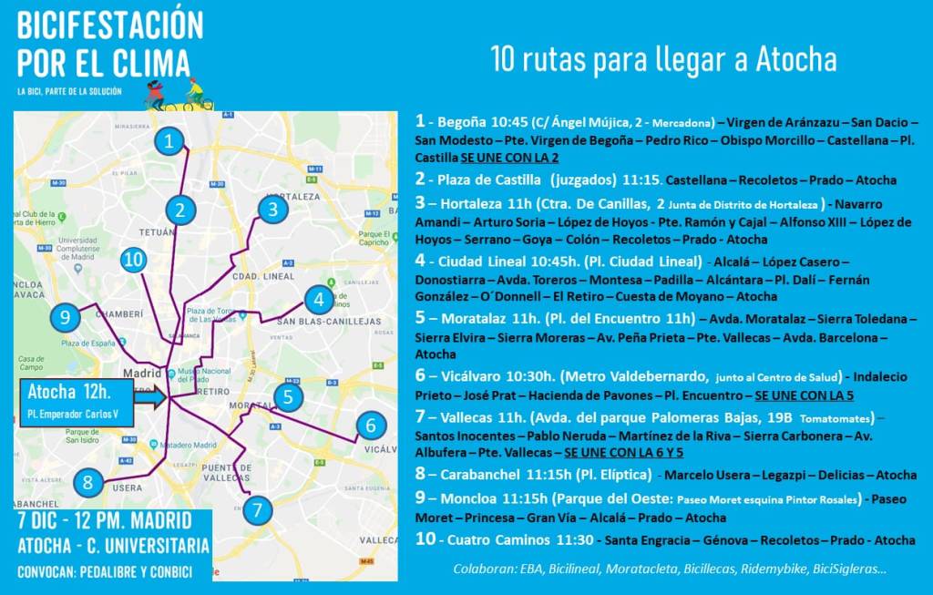 También animamos a la participación en todas las actividades que están programadas estos días (podéis consultar la programación más arriba), como la Bicifestación del sábado 7. Una de sus columnas partirá de la Plaza de Ciudad Lineal a las 10:45 h, para llegar a la Plaza de Atocha sobre las 12 h.