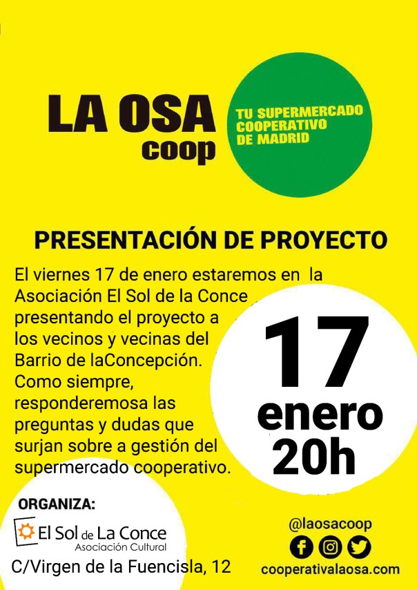La presentación del Supermercado Cooperativo LA OSA comenzará a las 20:00 h en la sede de la Asociación Cultural El Sol de La Conce. Te recordamos la dirección: C/ Virgen de la Fuencisla, 12. <M> Barrio de La Concepción.