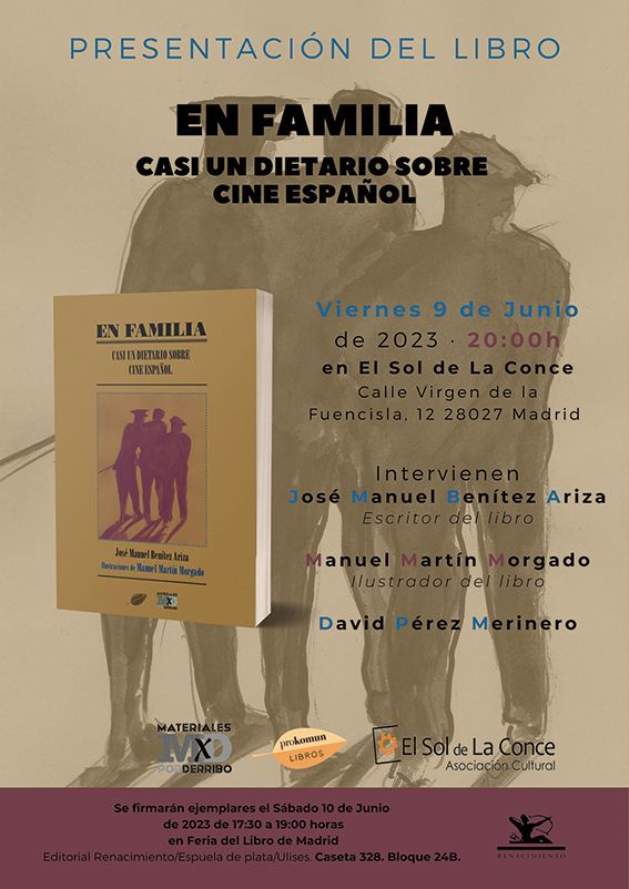 El próximo viernes, 9 de junio, a las 20 h, os invitamos a la presentación del libro «En familia. Casi un dietario sobre cine español» de José Manuel Benítez Ariza. Charlaremos con el autor, con su ilustrador Manuel Martín Morgado y con David Pérez Merinero.