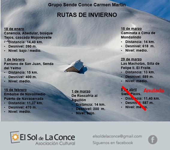 | 1 de abril a las 7:45 | Pza. Virgen del Romero | Vehículo propio compartido. | 13 Km / 900 m / 1150 m. | Nivel ALTO/ 8 horas |