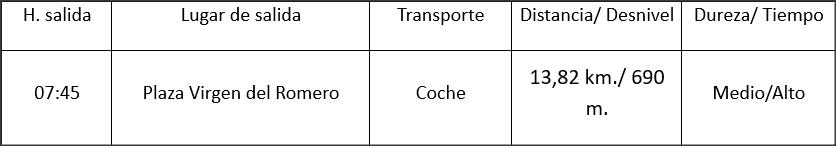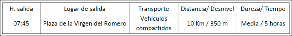 | 07:45 | Plz. Virgen del Romero | Vehículos compartido | 13,5 Km / 550 m | Media / 5 horas |