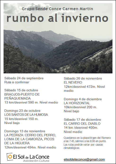 Os dejamos la relación de rutas senderistas previstas desde el presente mes de septiembre hasta diciembre. Os iremos dando más detalle conforme se acerquen las fechas.