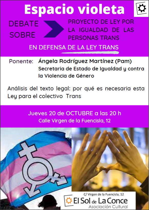 El próximo jueves, 20 de octubre a las 20 hrs., continuando con los debates que hemos organizado sobre la Ley Trans, nos acompañará Ángela Rodríguez Martínez (Pam), Secretaria de Estado de Igualdad y contra la Violencia de Género. Nos hablará de la Ley Trans, de por qué va a mejorar la vida de las personas Trans, y de la razón por la que el gobierno ha decidido aprobarla por el trámite de urgencia. Es una oportunidad única para que nos aclare las dudas que, desde una parte del movimiento feminista, suscita esta Ley.