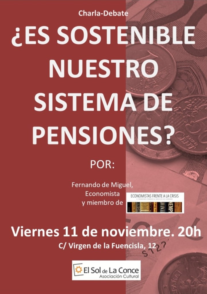 El viernes 11 a las 20 horas tendremos una charla debate sobre el sistema de pensiones con el economista Fernando de Miguel. Como siempre, os esperamos en C/Virgen de la Fuencisla, 12.