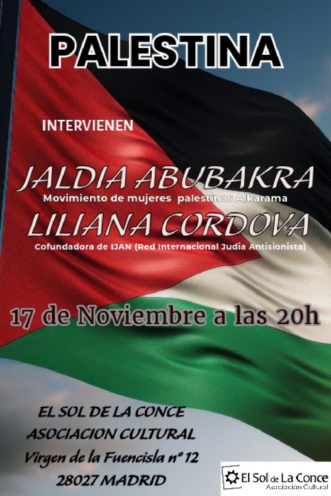 El próximo viernes 17 de noviembre a las 20h, hablaremos con Jaldía Abubraka (Movimiento de mujeres palestinas Alkarama) y Liliana Córdova (cofundadora de la Red Internacional Judía Antisionista) de la situación en Palestina, de su historia, de la ocupación ilegal de su territorio, del régimen de apartheid que sufre su pueblo, de los abusos y opresión que vienen soportando desde hace setenta y cinco años y del actual genocidio en Gaza.