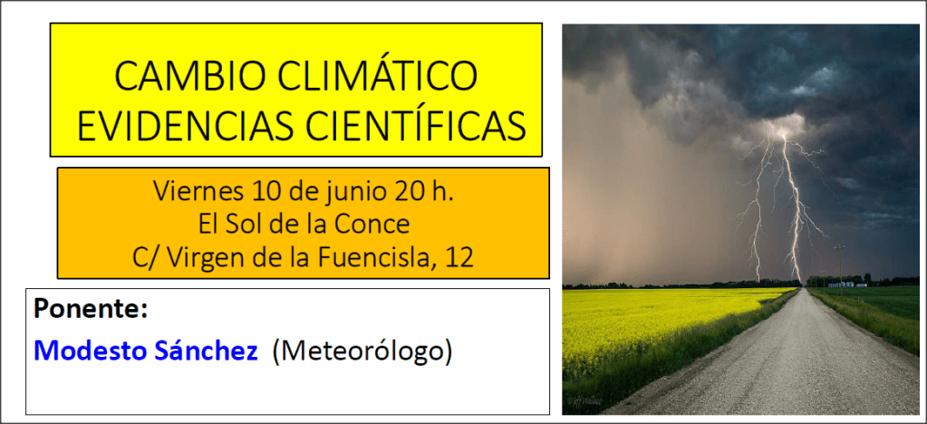 El próximo viernes 10 de junio estaremos con el meteorólogo Modesto Sánchez, que nos dará una charla científica sobre conceptos básicos como el efecto invernadero, el calentamiento global, el Panel Internacional sobre Cambio Climático (IPCC), los modelos climáticos y todo aquello que queráis conocer sobre esta importante cuestión.