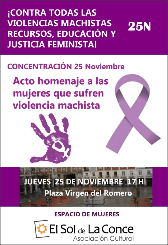Concentración el próximo 25 de noviembre a las 17h, en la plaza Virgen del Romero, en un acto de homenaje a las mujeres que cada día sufren violencia machista. ¡Contra todas las violencias machistas, recursos, educación y justicia feminista!