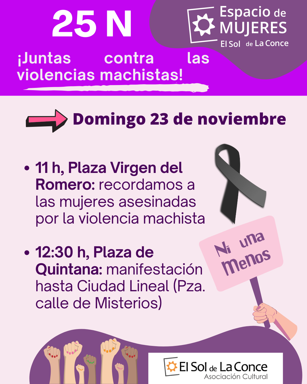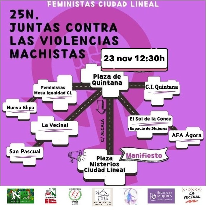 - 12:30 h, en la Plaza de Quintana: las asociaciones y plataformas feministas del Distrito de Ciudad Lineal marcharemos por la calle Alcalá hasta la Plaza de los Misterios, en Ciudad Lineal, para gritar alto y fuerte contra todas las violencias machistas.